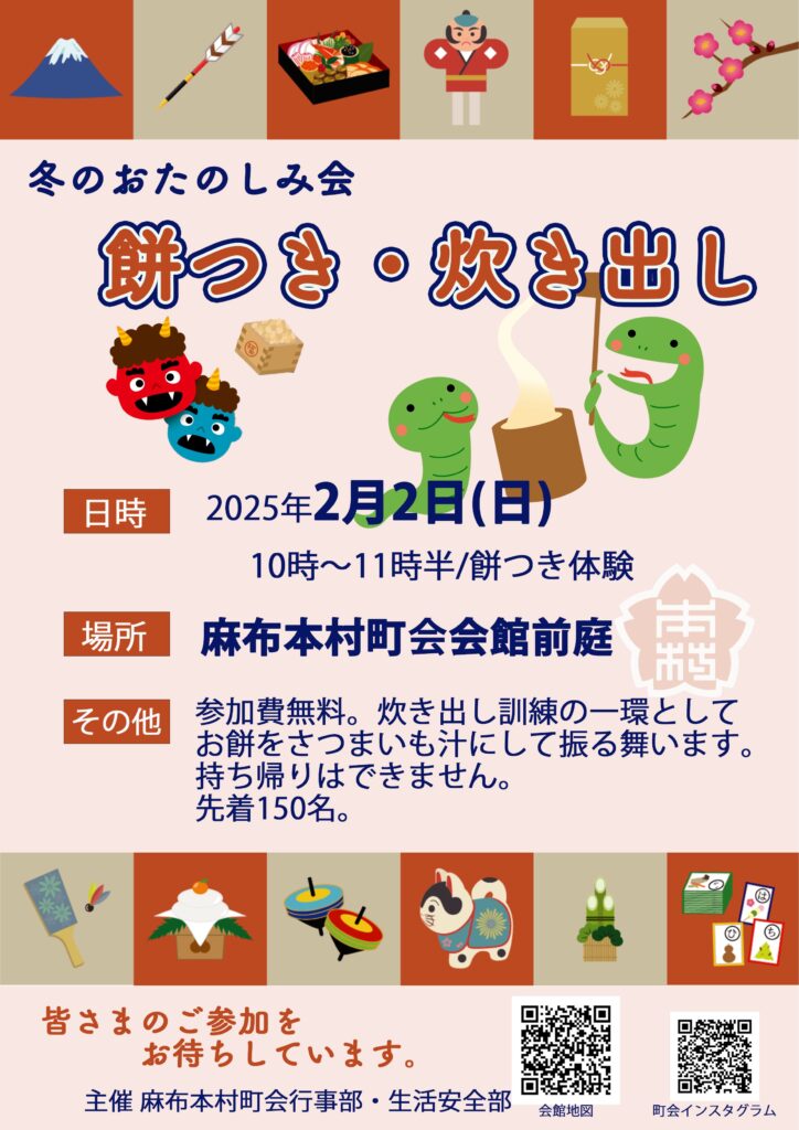2025年1月25日 / 最終更新日時 : 2025年1月25日 hommura_admin お知らせ 冬のおたのしみ会のお知らせ 【冬のおたのしみ会のご案内】今年もお餅つきをします。先着150名様、餅つき体験と、炊き出し訓練の一環としてつきたてお餅入りのさつまいも汁を振る舞います。ぜひご参加ください。参加は無料です。