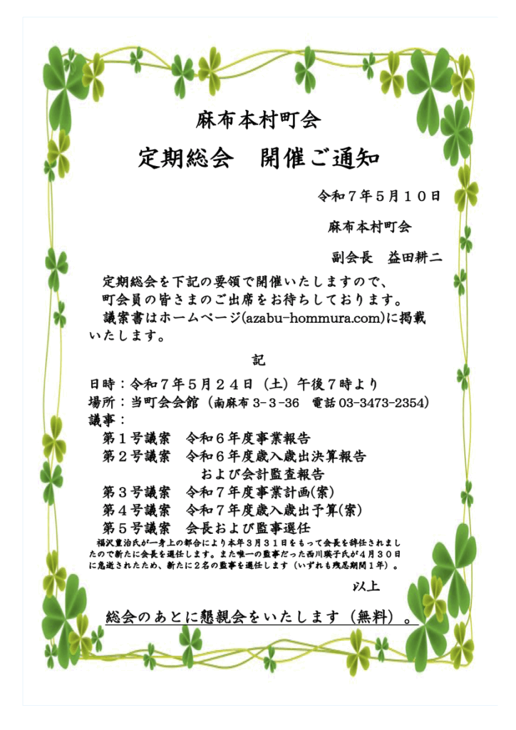 2025年5月13日 / 最終更新日時 : 2025年5月13日 hommura_admin お知らせ 令和7年定期総会 開催します 5月24日(土)午後7時より、令和7年麻布本村町会定期総会を開催します。詳細は添付のご通知、および、議案書をご確認ください。町会の皆さまのご出席をお待ちしております! 2025年定期総会議案書ダウンロード